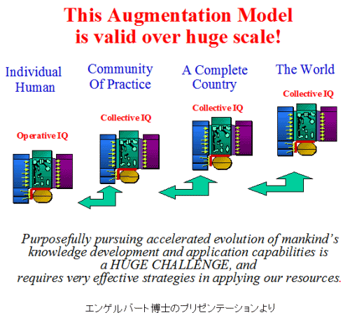 この返答によって今までよくわからなかったことが霧が晴れるようにわかった気分になったしだいです。 もう一つ、このモデルは世界の話から人の話にまで、入れ子構造で当てはめて考えることによって、現場に根付くシステムとしての全体の整合性がでてくると思います。エンゲルバートも次の図のようなプリゼンテーションを行っています;